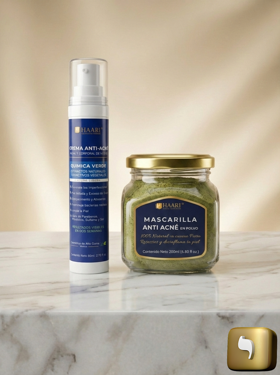 Descubre el poder de la naturaleza para combatir el acné con nuestra Doble Acción Anti-Acné: Crema Facial y Corporal + Mascarilla en Polvo 100% Natural.
